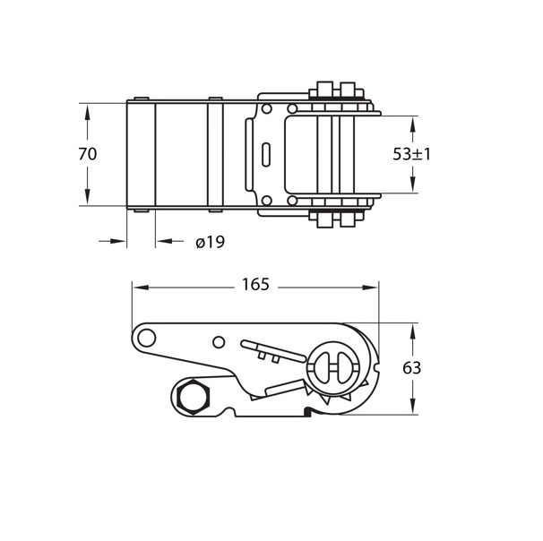 Đầu tăng đơ (Ratchet Buckle) là bộ phận cơ khí sử dụng để siết chặt dây đai chằng hàng. Với bản rộng 50mm (5cm), sản phẩm này phù hợp với các loại dây đai có bản tương đương, thường dùng để chằng hàng hóa vừa và nặng.