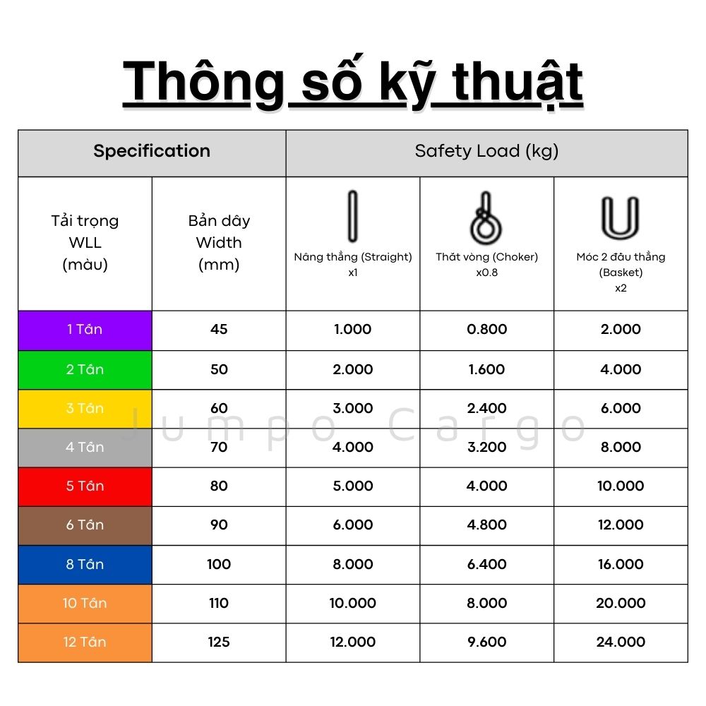Cáp Vải Jumpo Cargo được sử dụng nguyên liệu chọn lọc, thiết kế và sản xuất theo tiêu chuẩn cao, đủ các chủng loại có khả năng chịu tải từ 1 tấn đến 200 tấn chiều dài từ theo yêu cầu, hệ số an toàn 7:1.