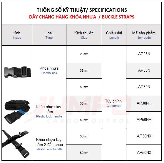 - Jumpo Cargo là công ty chuyên thiết kế, sản xuất và cung cấp sỉ và lẻ các loại Dây Cảo Chằng Hàng Tăng Đơ với nhiều tùy chọn theo nhu cầu sử dụng khác nhau: