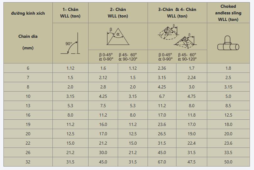 Tải trọng: 1 – 12 tấn tùy theo cỡ xích.