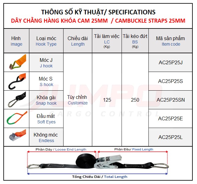 - In particular, Jumpo Cargo specializes in designing and manufacturing Cargo Lashing models for each industry: Cargo lashings connecting steel pipes, oil and gas, water supply and drainage pipes, container door lashings to protect cargo safety, lashings 2 rectangular eyelets, triangular eyelets, D-ring straps, 1-hook, 1-eye hooks, 2-ring self-tightening straps, pallet straps, D-ring straps,...