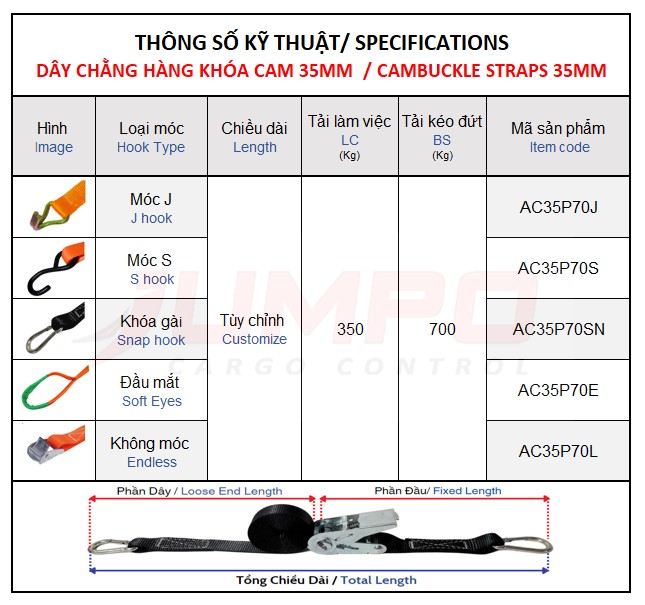 - In particular, Jumpo Cargo specializes in designing and manufacturing Cargo Lashing models for each industry: Cargo lashings connecting steel pipes, oil and gas, water supply and drainage pipes, container door lashings to protect cargo safety, lashings 2 rectangular eyelets, triangular eyelets, D-ring straps, 1-hook, 1-eye hooks, 2-ring self-tightening straps, pallet straps, D-ring straps,...