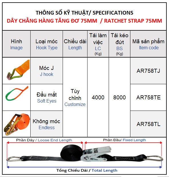 - Types of lashing straps: 25mm, 38mm, 50mm, 75mm, 100mm
