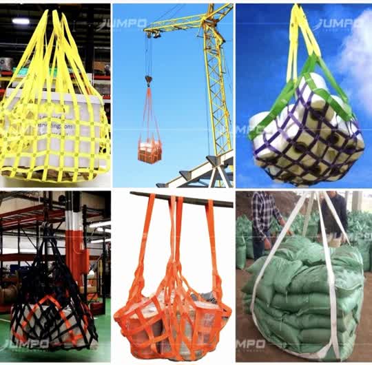 Lưới được sử dụng kết hợp với móc cẩu hoặc sling cáp vải, dễ thao tác và phù hợp với nhiều loại cần cẩu, palang hoặc xe nâng có móc.