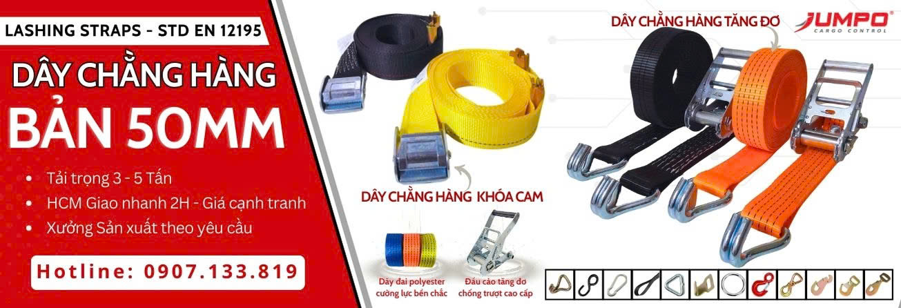 Dây chằng hàng bản 50mm do Jumpo Việt Nam sản xuất theo tiêu chuẩn Châu Âu - linh hoạt, bền bỉ phù hợp cố định hàng từ trung bình đến nặng. Thiết kế an toàn, dễ sử dụng cho xe tải, pallet và kho bãi.