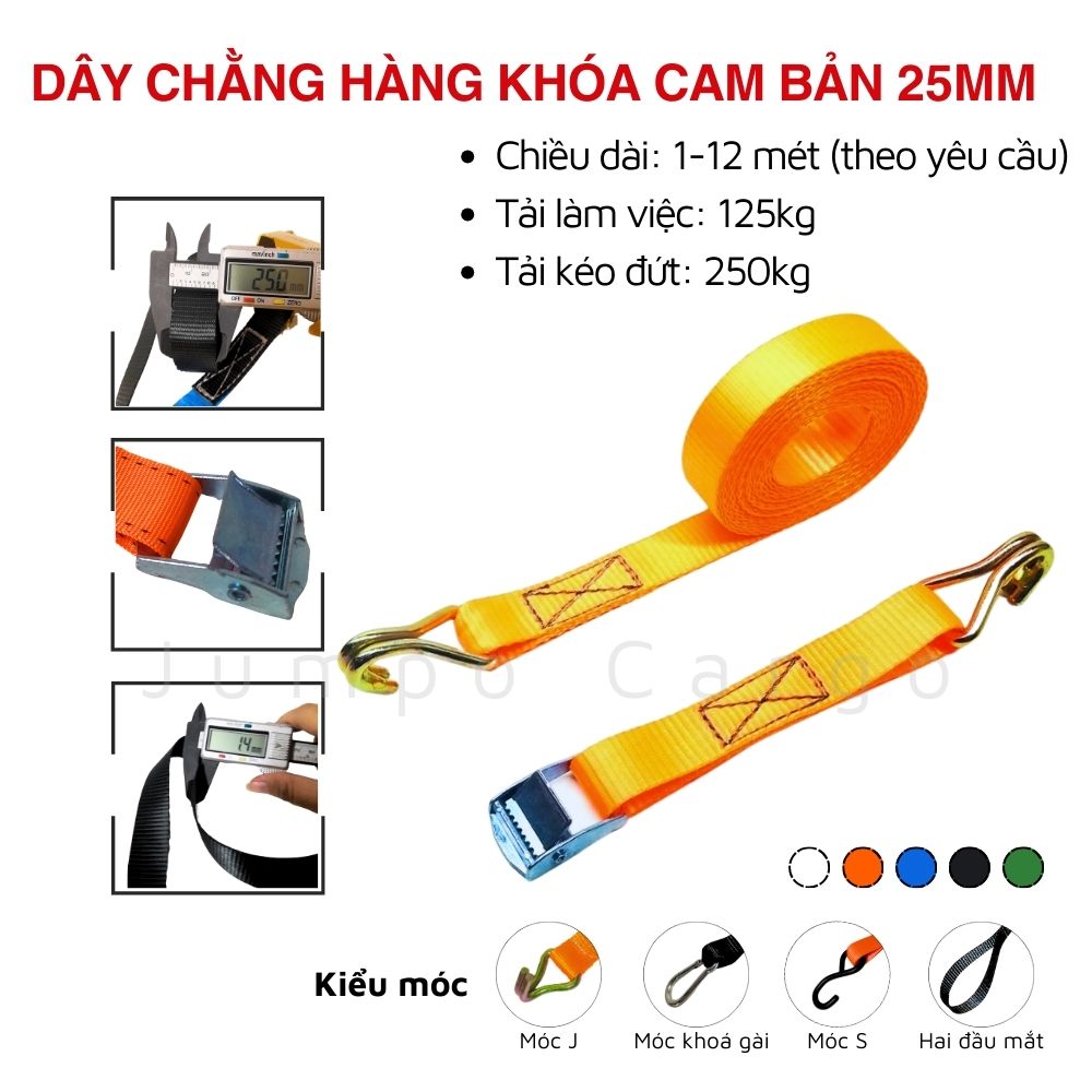 Dây chằng hàng khóa cam là một loại dây ràng hàng có cấu tạo đơn giản gồm dây đai polyester bản từ 25mm – 35mm – 50mm, kết hợp với khóa cam nhấn tay để điều chỉnh độ siết. Khác với dây chằng tăng đơ (ratchet), loại dây này không có cơ cấu bánh răng siết mạnh mà dùng áp lực tay nhấn để siết giữ dây, phù hợp cho việc cố định hàng nhẹ và thao tác nhanh.