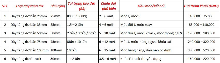 Dây chằng hàng bản 50mm (2 inch): Phổ biến nhất. Dùng cho xe tải, pallet, máy móc công nghiệp, container, đặc biệt tương thích tốt với hệ E-track.