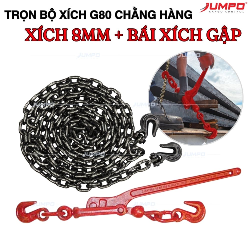 Bộ xích chằng hàng G80 Jumpo gồm xích G80 phi 8/10/12mm, móc gài xích và cảo tăng đơ, dùng siết – cố định hàng nặng trên container, rơ mooc, xe thớt. Xích thép G80 chịu lực lớn, bền, an toàn Trọn bộ: xích + 2 móc gài + cảo tăng đơ Lắp ráp theo yêu cầu chiều dài – kiểu móc Sản xuất theo tiêu chuẩn: EN- 12195-3 Đầy đủ CO, CQ, TEST tải (theo yêu cầu) Hỗ trợ kiểm định & báo giá nhanh LIÊN HỆ: 0907.133.819 để được hỗ trợ nhanh nhất