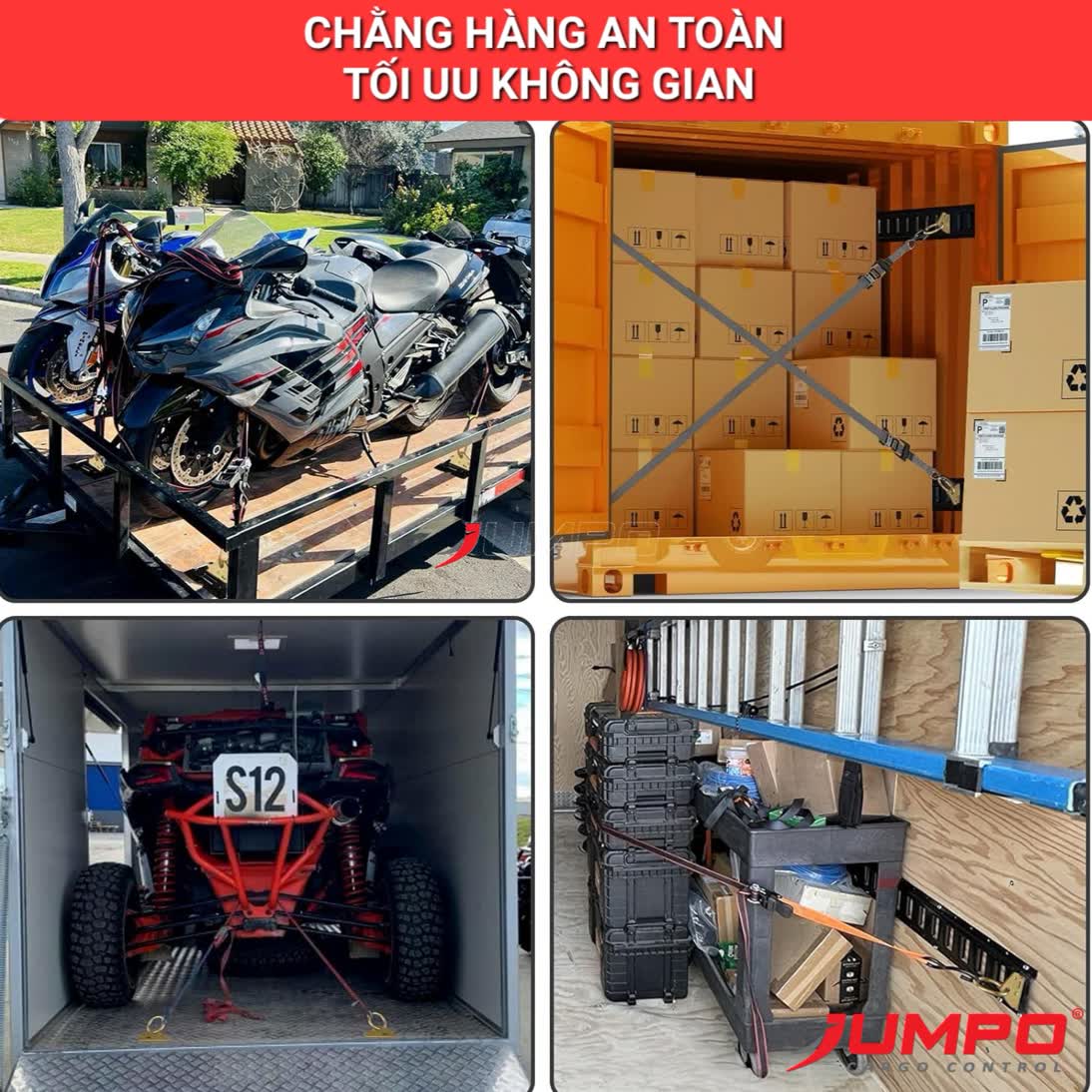 ✅ Tăng độ an toàn hàng hóa: giúp cố định chắc kiện hàng, không bị trượt khi xe phanh gấp hoặc vào cua.