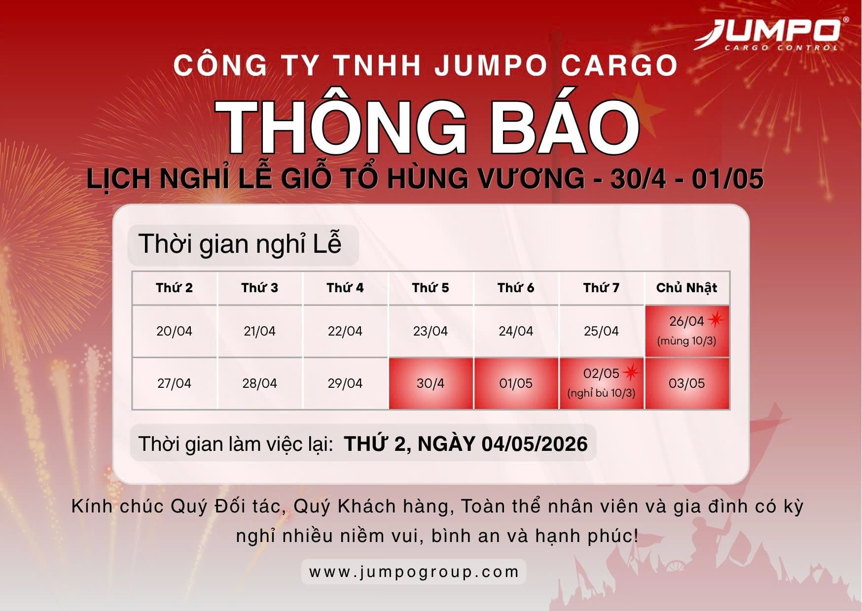 Công ty TNHH JUMPO CARGO xin trân trọng thông báo lịch nghỉ các ngày lễ sắp tới như sau: